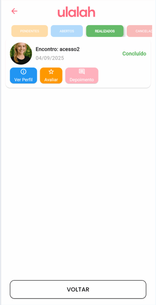 Estes são os passos para avaliar um Encontro no APP. Abaixo, consulte os passos para entender o Ulalah.